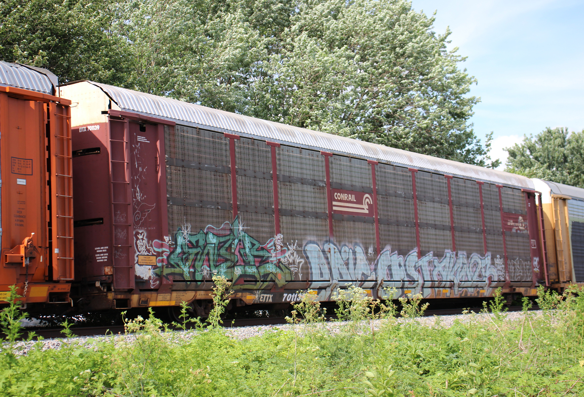 ETTX 701139 is seen in the consist of CSX Q216-24 at Newark, DE on 6/27/21. Rack number is CR 7199, built 3-89, rebuilt 4-97 and is now owned by NS.