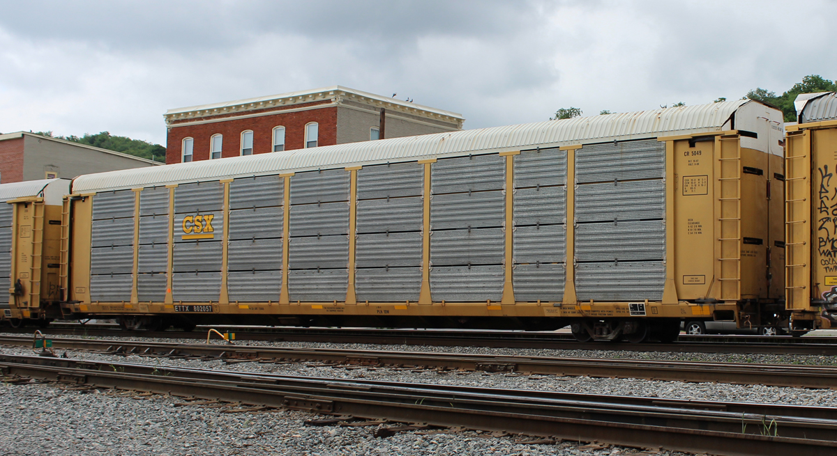 ETTX 802057 is seen in the consist of CSX Q216-10 at Cumberland, MD on 6/12/14. Rack number is CR 5049, built 10-87 and rebuilt and repainted CSX in 8-08.