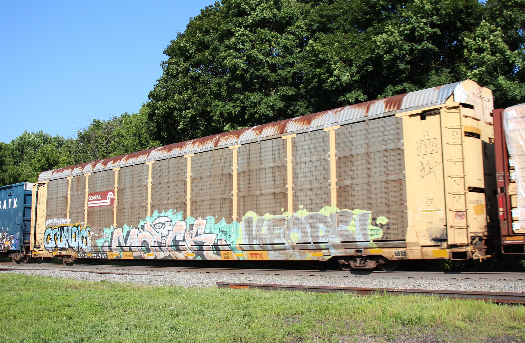 ETTX 852949 is seen in the consist of CSX M410-22 at Elk Mills, MD on 7/23/23. Rack number is CR 6160, built 6-89, rebuilt and repainted yellow 3-98 and is now owned by NS.