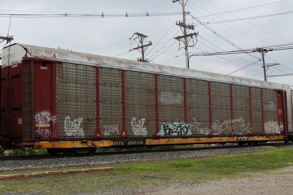 Flatcar ETTX 907943 is seen here with CR class ML3K rack #6116. Rack was built 6-88, rebuilt 12-97.