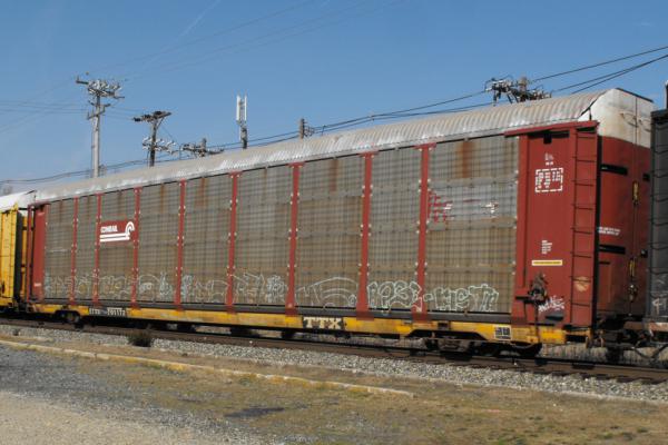 Flatcar ETTX 907943 is seen here with CR class ML3K rack #6116. Rack was built 6-88, rebuilt 12-97.