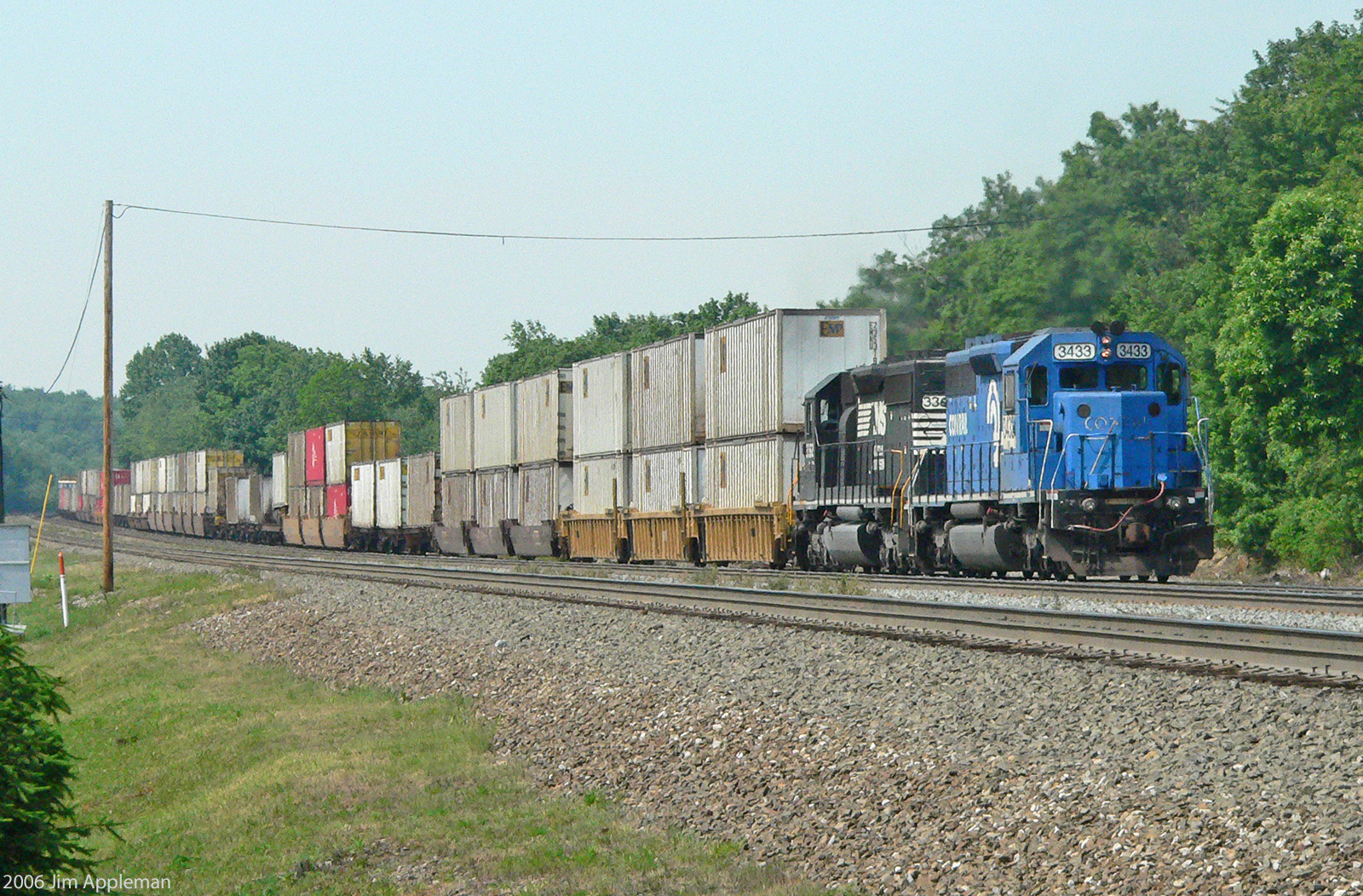 NS 3362 & 3433 helpers remain coupled to the tail end of a westbound intermodal as the ascent down the west slope begins.