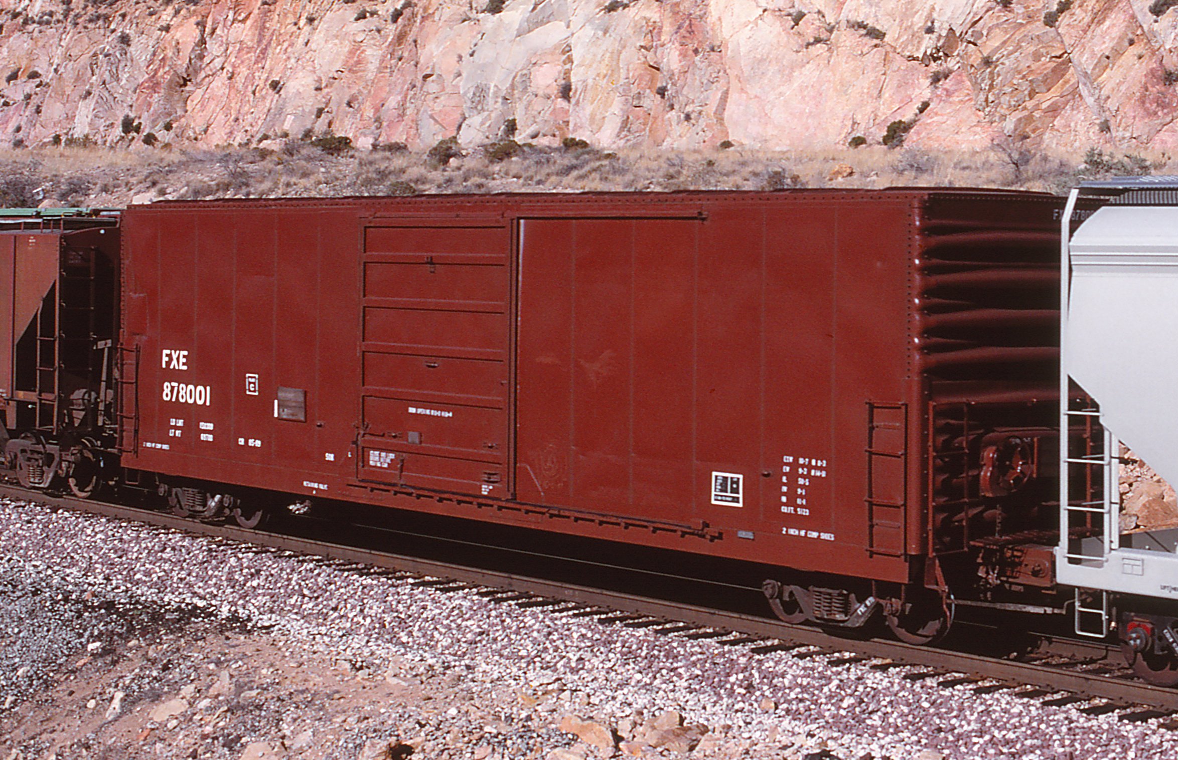 FXE 878001 is seen at Valentine, AZ on 4/15/00. Car is ex CR 266824/PC 266824 and was built 6-72. It was re-stenciled on 10/1/03 to ANGX 4085 and was then deleted 7/26/06.