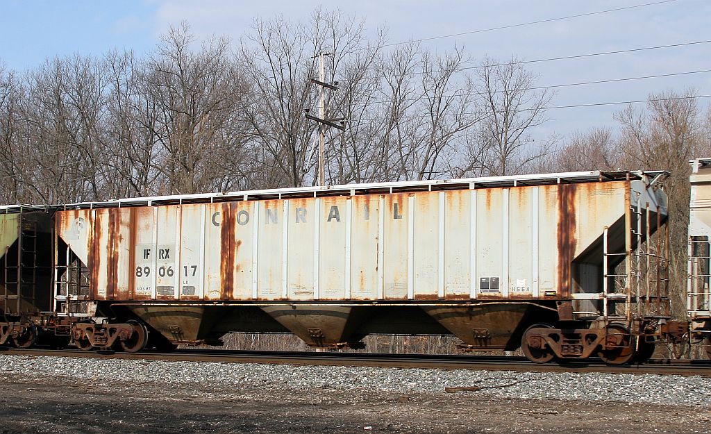 Now owned by IFRX, this is a former CR class H56A covered hopper. On CSX, Kent, Ohio.