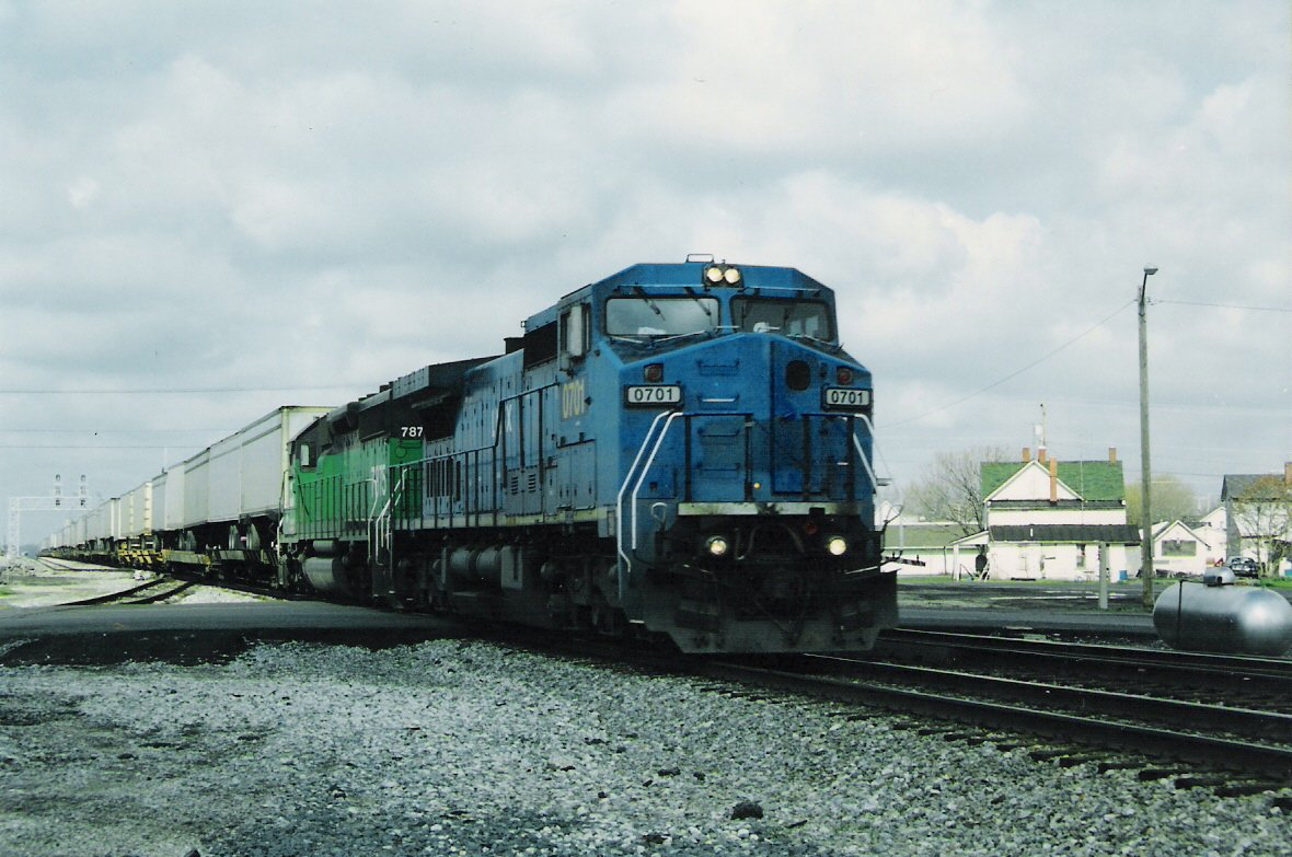 Former LMS 701(LMSX 0701 in this shot, now CSXT 7919) leads CSX train Q186 at Deshler, OH on April 12, 2000