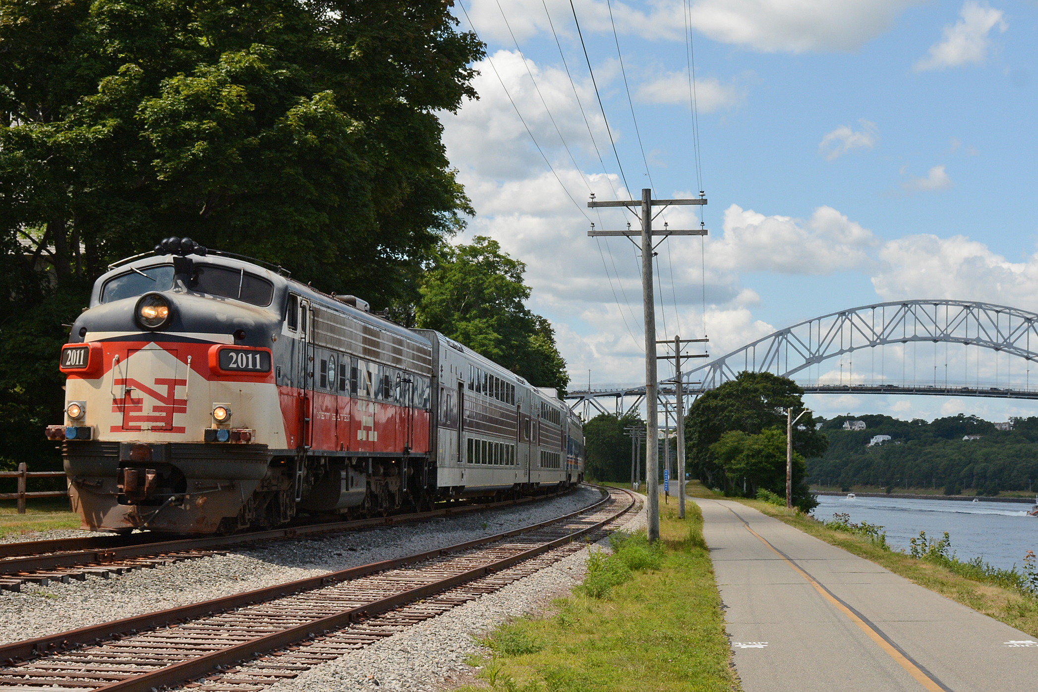 NH 2011 (owned by Massachusetts Coastal RR) EMD FL9 Bay Colony Main Line Bourne MA with unknown train