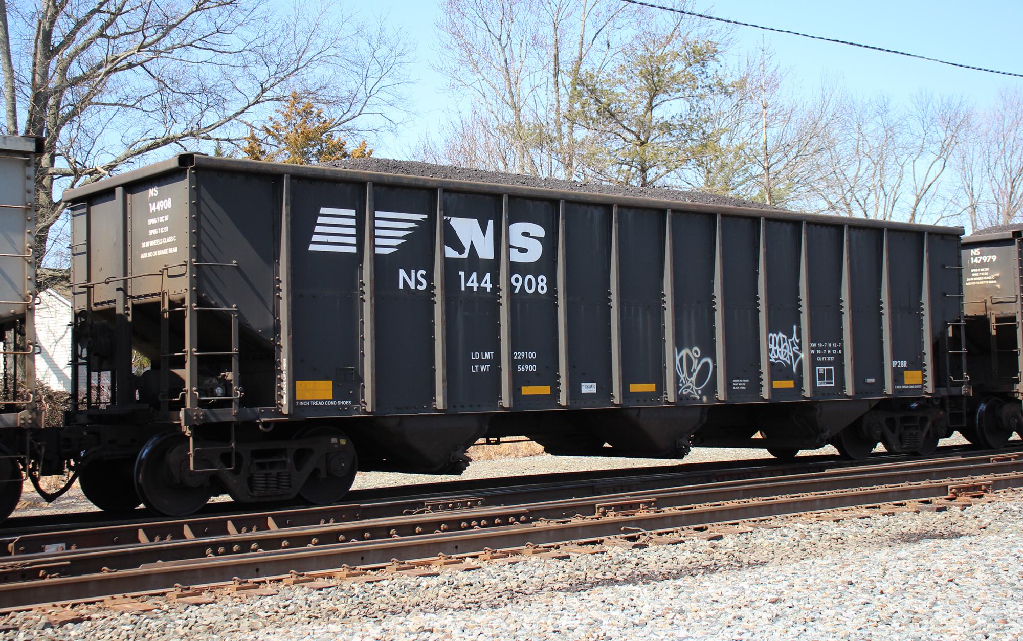 NS 144908 is seen in the consist of NS Y90 at Perryville, MD on 3/20/21. Car is ex CR 496040, which was built as a CR H2 class hopper, in 6-94 (stenciled 7-94). Then was re-bodied and renumbered to NS 144908 in 12-13 by FCA at Roanoke, VA.