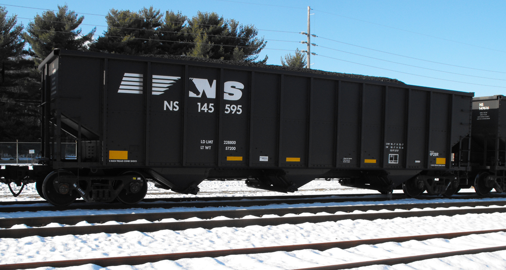 NS 145595 is seen at Deepwater, NJ on 12/12/13. Car was re-bodied from CR 496996 in Sept of 2013 by Freight Car America in Roanoke, VA. CR 496996 was built 10-94 by HCS as a H2 class 4 bay hopper. Car is stenciled as being built 6-94, which is incorrect.