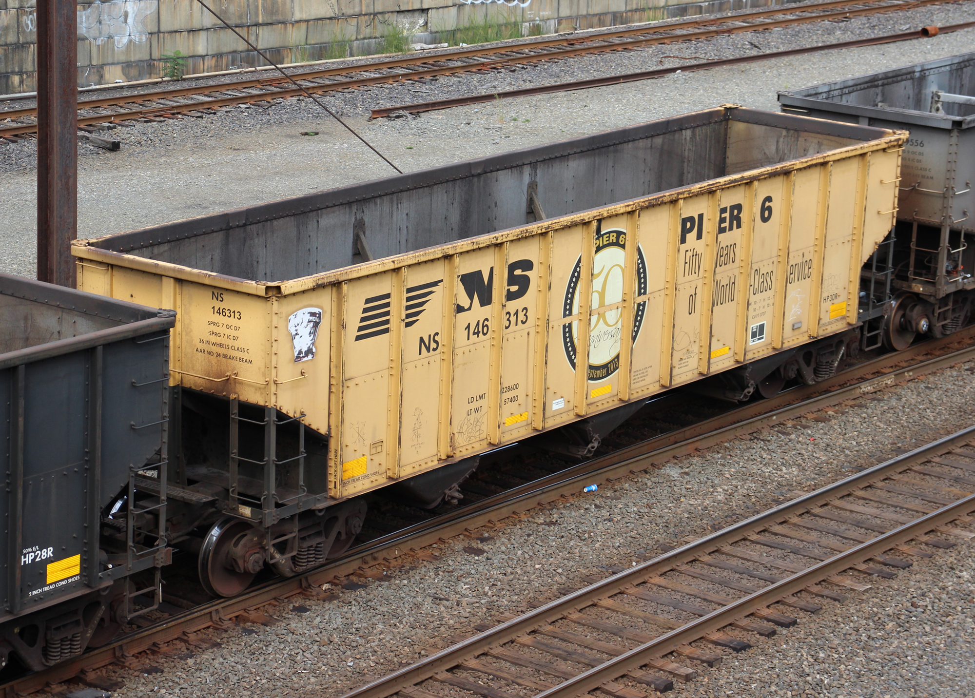 NS 146313 is seen in the consist of NS Y91 at Harrisburg, PA on 9/4/21. Car is ex CR 498454/NYC 498454, which was built as a CR H2C class hopper, in 4-98. It was then re-bodied and renumbered to NS 146313 in 8-13 by FCA at Roanoke, VA.