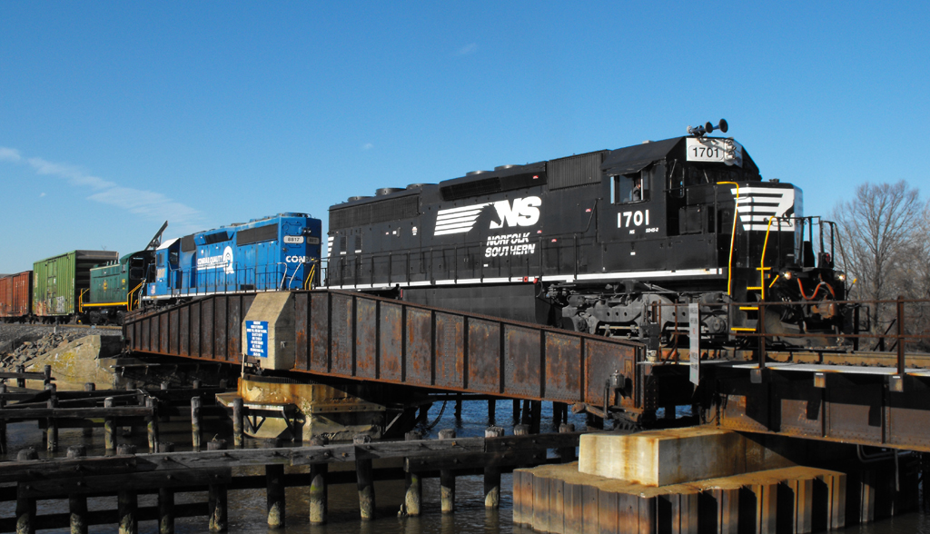 Former CR 6655 is seen leading former CR 6401 (CSX 8817) & SLRS 102 on CSAO train CA-11 over the Bridgeport Moveable Bridge at Bridgeport NJ on 12/12/09.