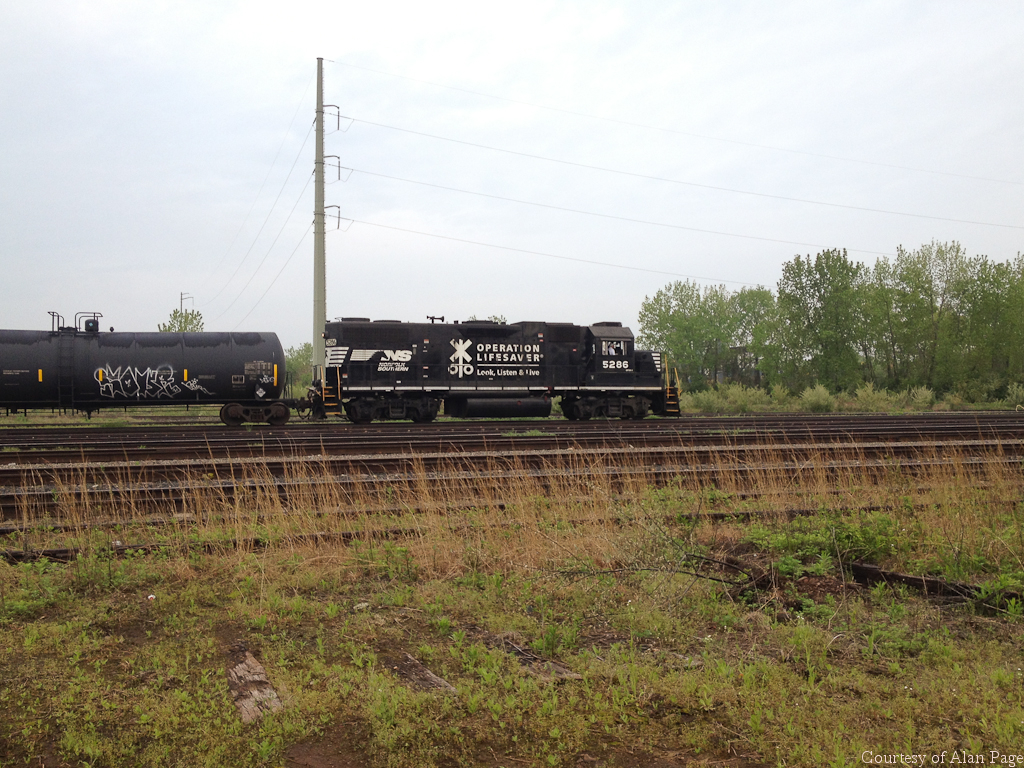NS GP38-2 5286 (CR 8085) shuffles GATX tank car 89658 through Morrisville yard on May 10, 2014.
