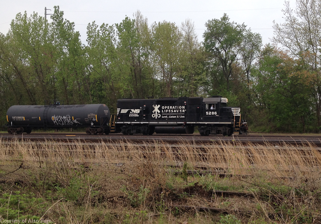 NS GP38-2 5286 (CR 8085) shuttles GATX tank car 89658 through Morrisville yard on May 10, 2014.