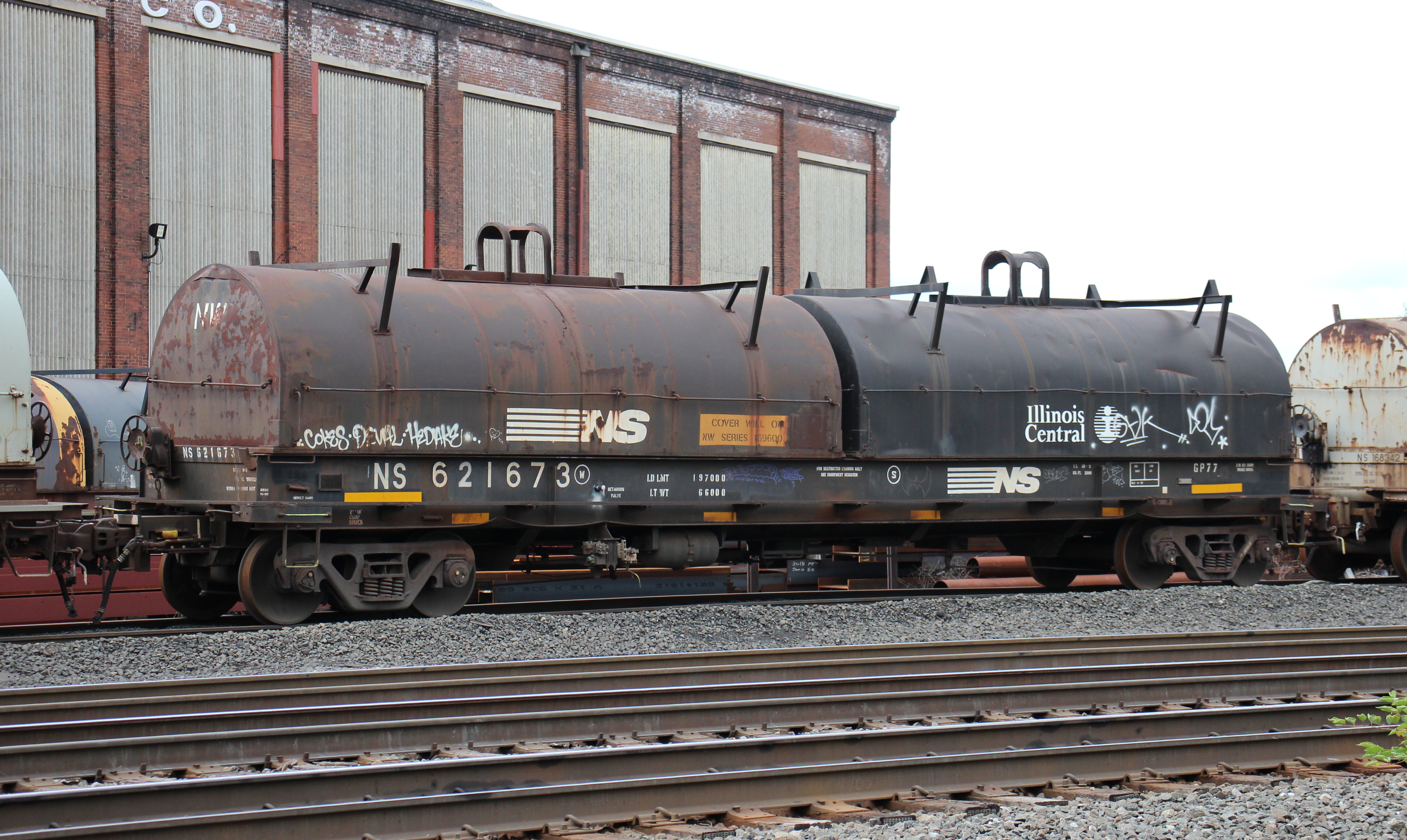 NS 621673 is seen at Altoona, PA on 6/25/23. Car is ex CR 627915/ROCK 955007, built 11-77 by SIECO and was painted NS RBSC 10-99.