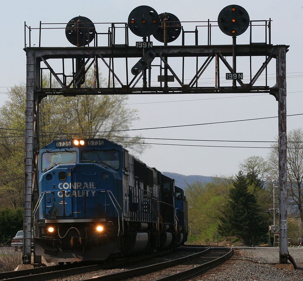I was unable to get on the sunny side for this shot so I had to settle for this shot of NS 6735 (ex CR 5606) ducking under the signals at McElhattan, PA