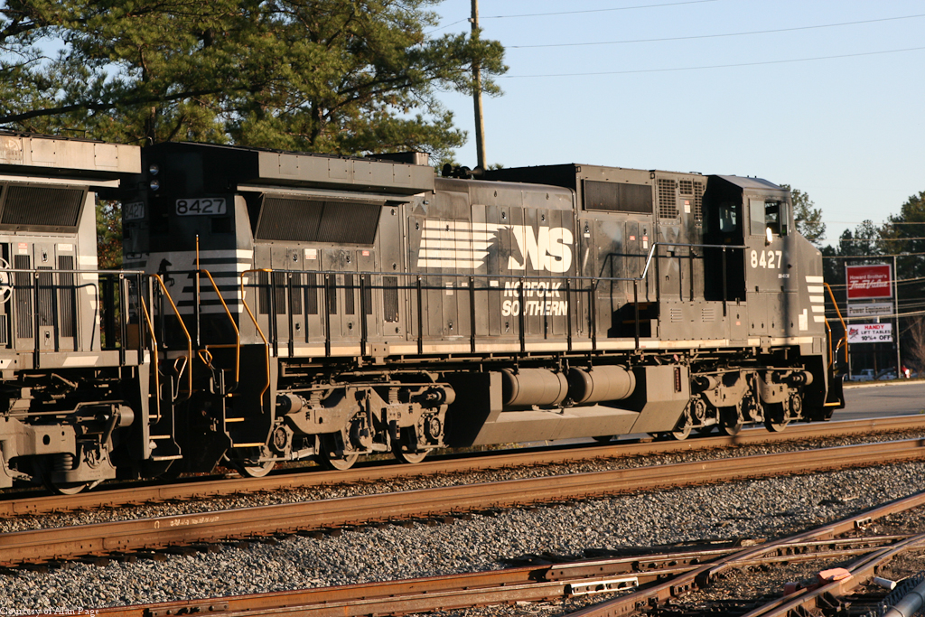 The cab door is closed as lead NS C40-8W 8427 (CR 6243) prepares to depart Duluth, GA with D9-40CW 9189, ES40DC 7695 and a load of hoppers on November 25, 2011.
