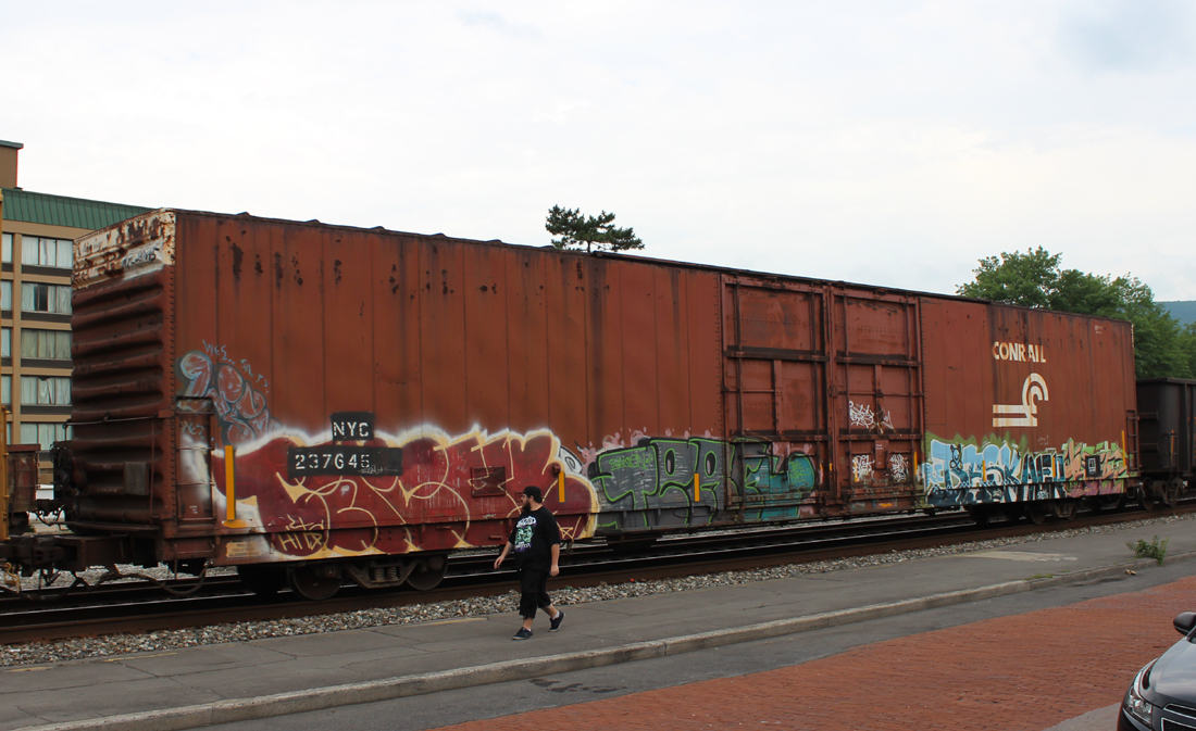 NYC 237645 is seen in the consist of CSX Q358-12 at Cumberland, MD on 6/13/15. Car is ex CR 237645/PC 237645/PRR 125111, built 4-66 and was rebuilt 10-90.