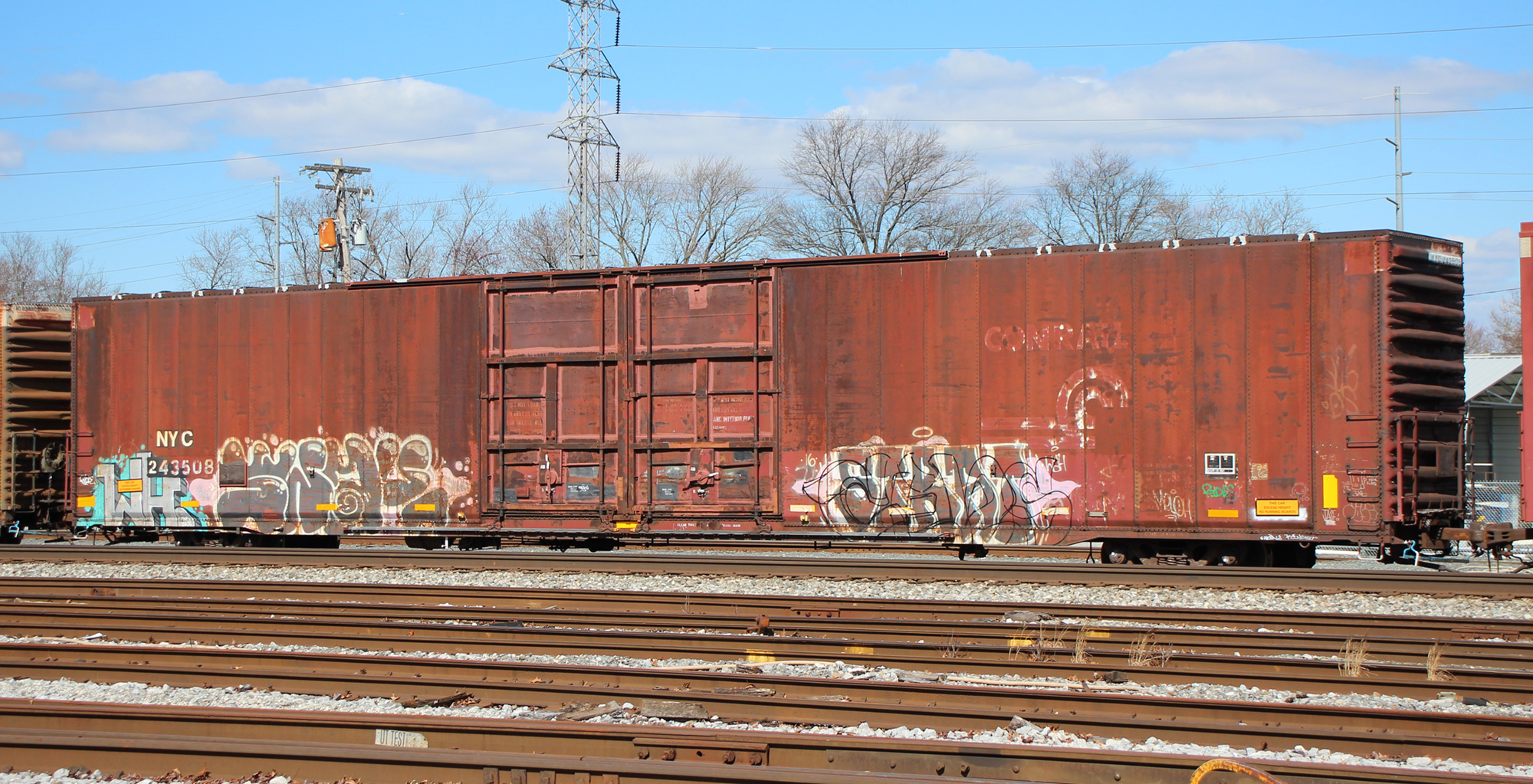 NYC 243508 is seen at Elsmere, DE on 3/10/24. Car is ex CR 243508/CR 297685 and was built 4-78 by Greenville Steel Car.