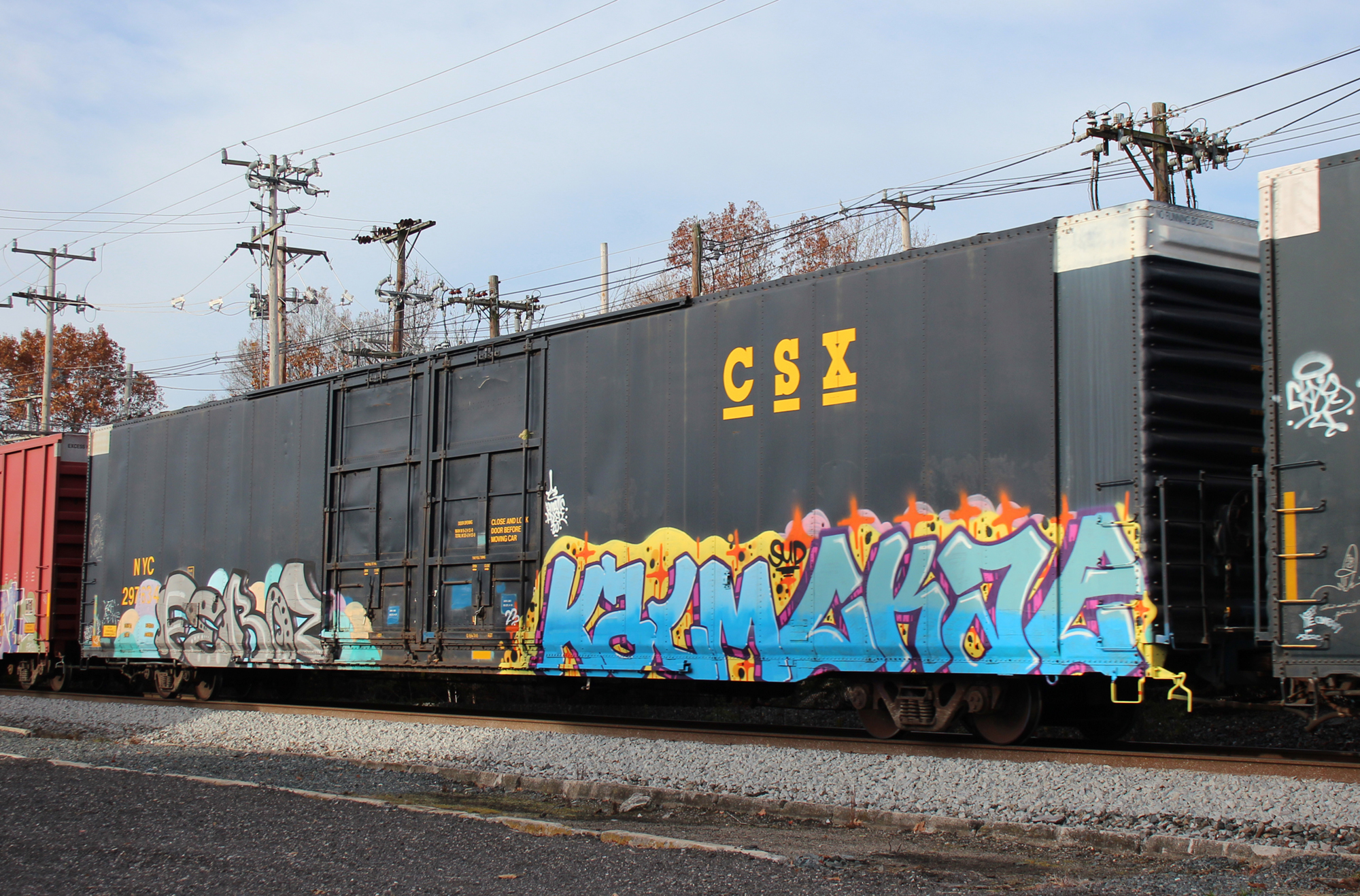 NYC 297634 is seen in the consist of CSX M372-16 at Newark, DE on 11/17/23. Car is ex CR 297634 and was built 4-78 by Greenville Steel Car.