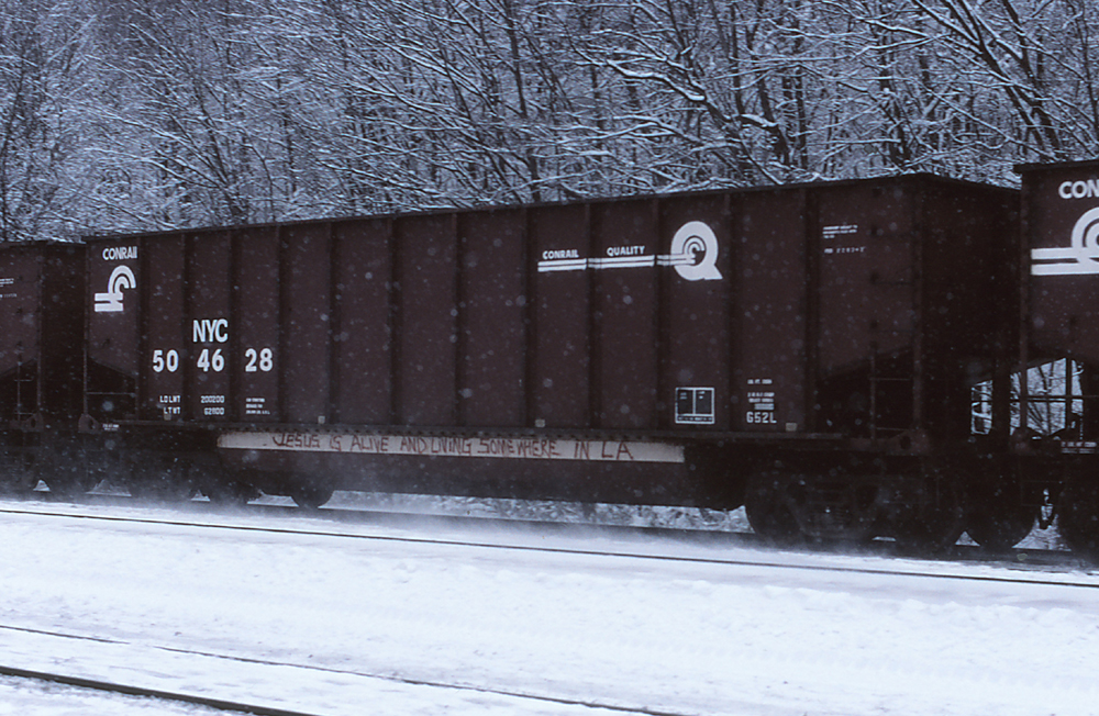 NYC 504628 is seen in the consist of XSG-400 at Lilly, PA on 3/5/99. Car is ex CR 504628/CR 476986/PRR 228342, built 11-65 and was deleted 1/23/09.