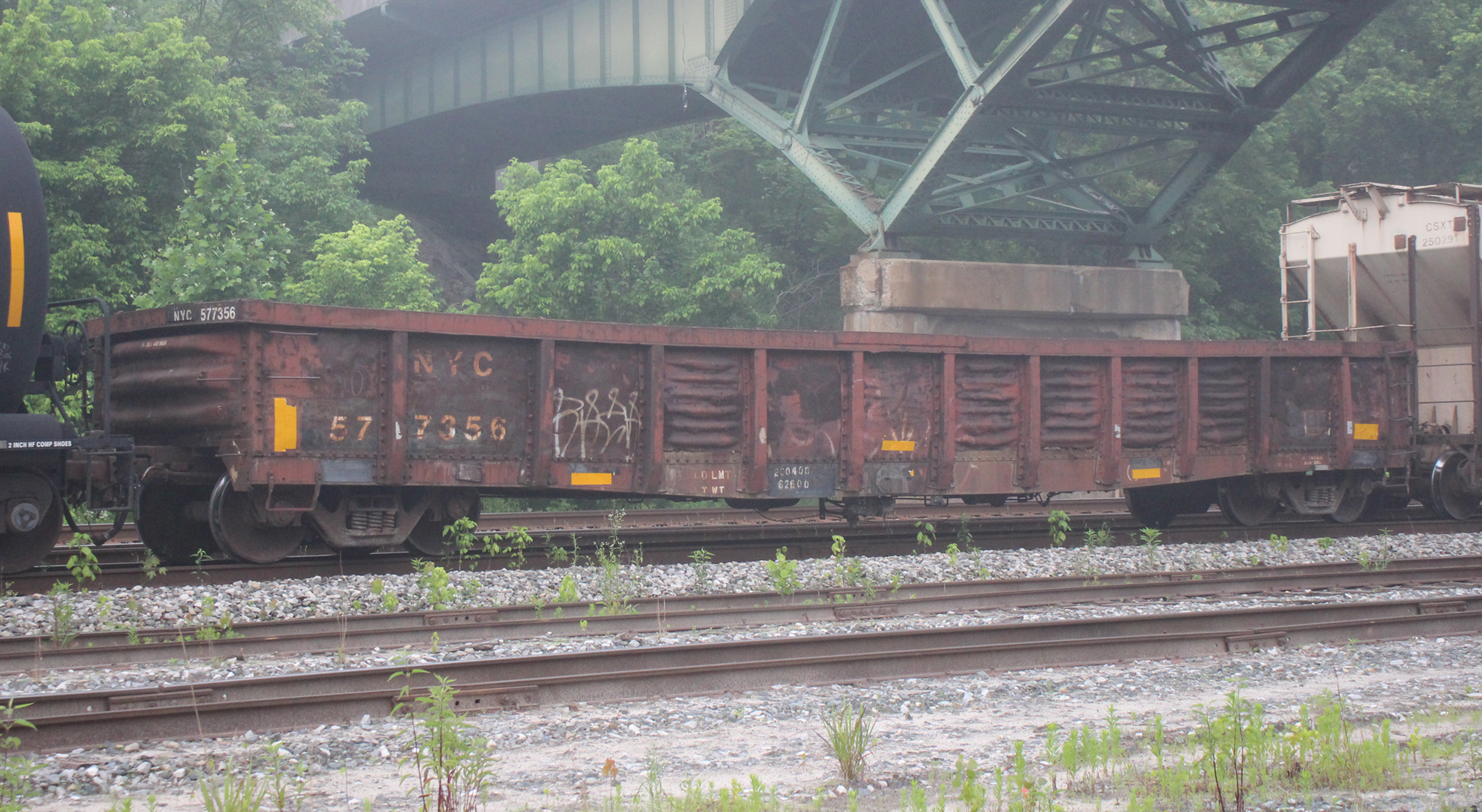 NYC 577356 is seen at Hancock, WV on 6/15/22. Car is ex CR 577356/PC 577356, built 5-68 and was painted CR-SR 5-6-91.