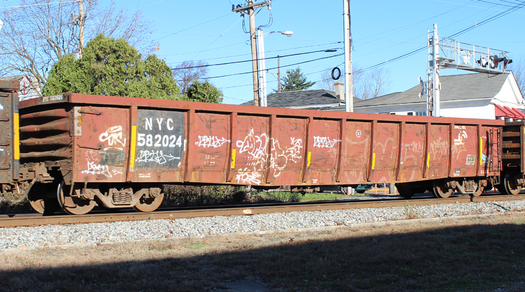 NYC 582024 is seen in the consist of CSX Q409-19 at Newark, DE on 11/19/15. Car is ex CR 582024 and was built 5-80 by CR.