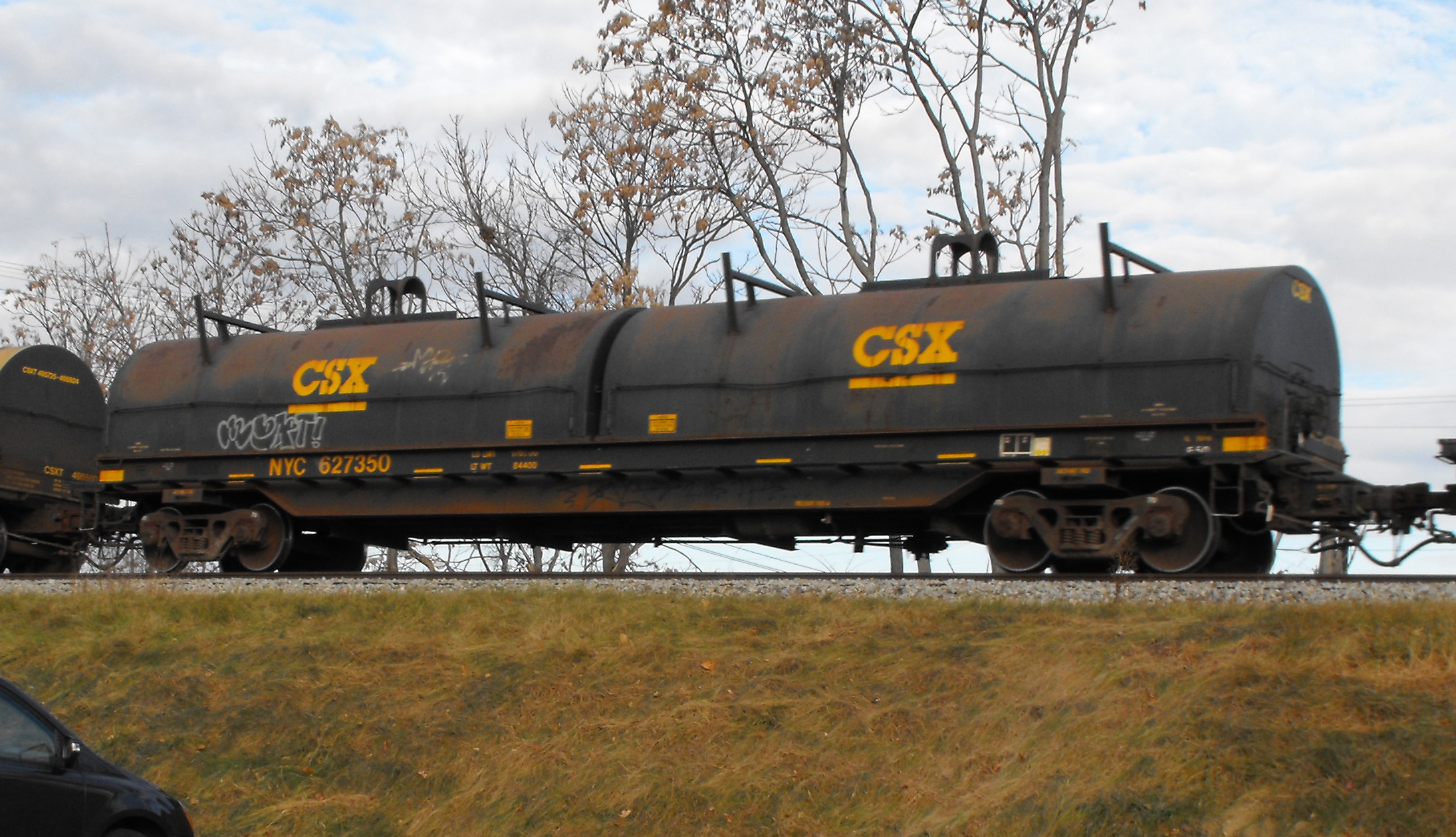 NYC 627350 is seen in the consist of CSX Q406-20 at Newark, DE on 11/21/13. Car is ex CR 627350/CR 752350/PC 752350, built 9-69 and was repainted CSX RA 9-04.