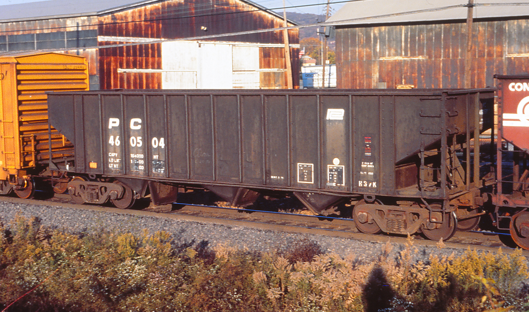 PC 460504 is seen at Temple, PA on 10/30/94. Car is ex PRR 271146 and was built as a H37A. It was rebuilt by PC in March of 1976 and was reclassed to H37K. It was deleted 5/17/96 by CR.