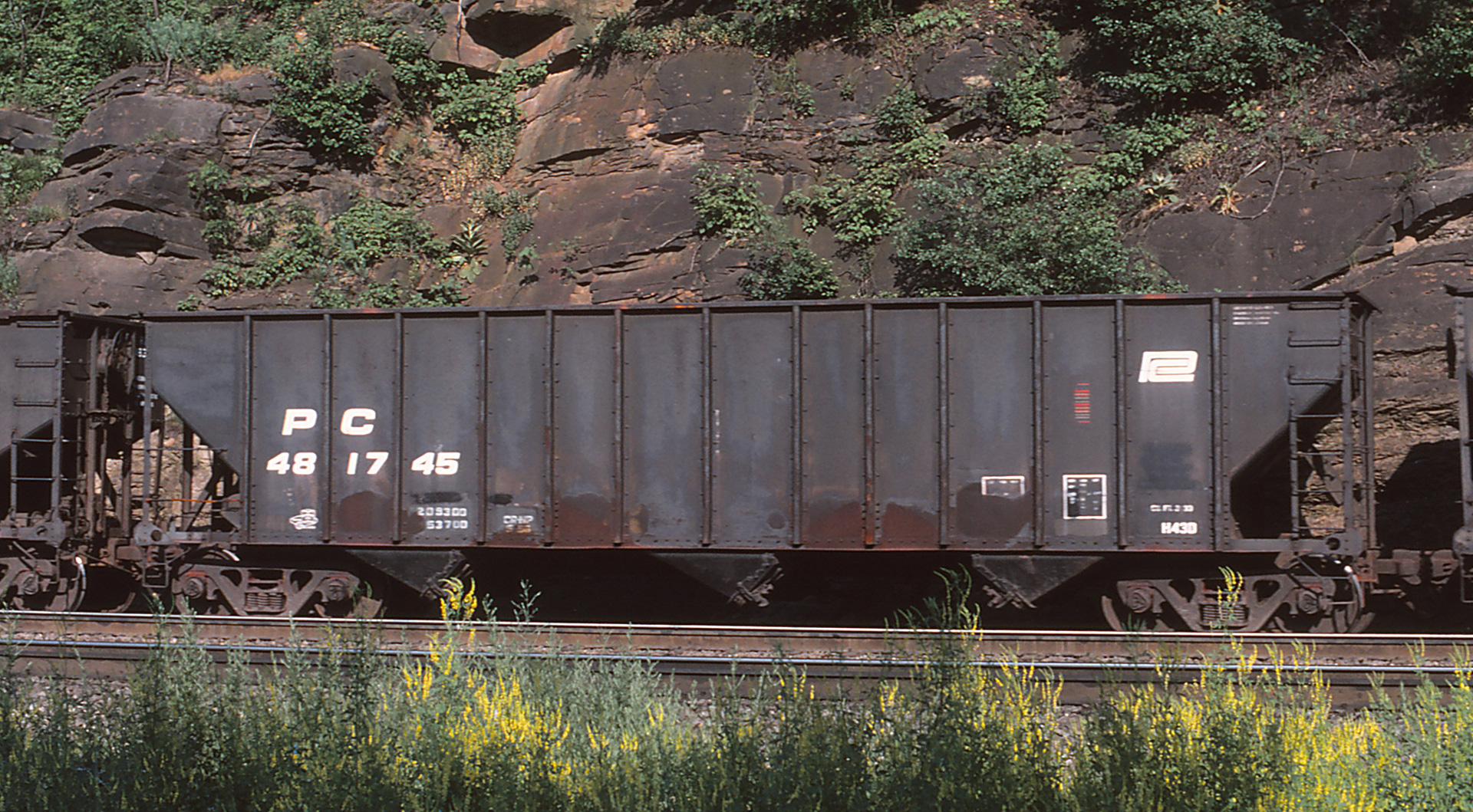 PC 481745 is seen rounding Horseshoe Curve in Altoona, PA in Jun of 1988. Car was built 1-72. In Aug of 1991, it was rebuilt into a coalporter by Hollidaysburg to CR 504563. After the 1999 split of CR this car became NYC 504563 which would be deleted 11-21-08 by CSX. Photo by Mark Hoeller.