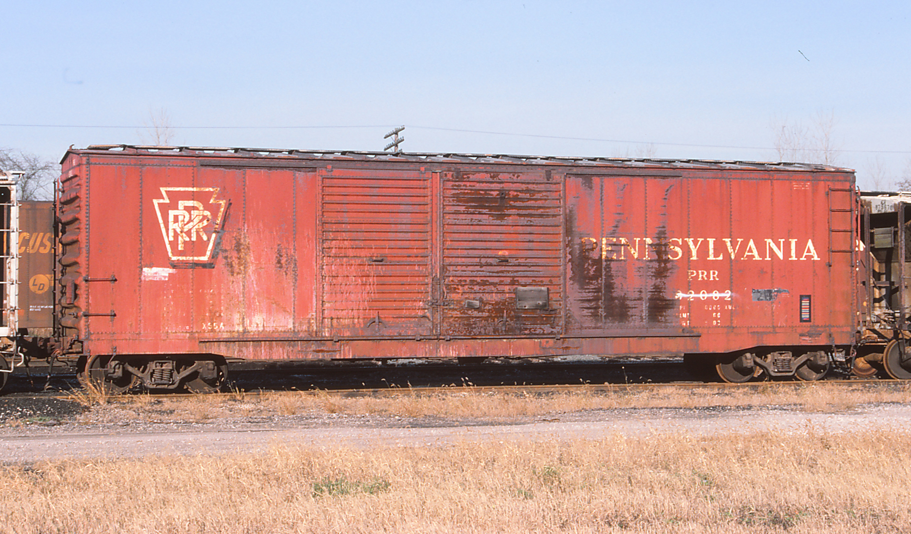 PRR 32082 is seen white-lined at Logansport, IN on 10/31/86. Car was built in 1961 at Altoona and was to become CR 230248, but as seen here it was never renumbered.