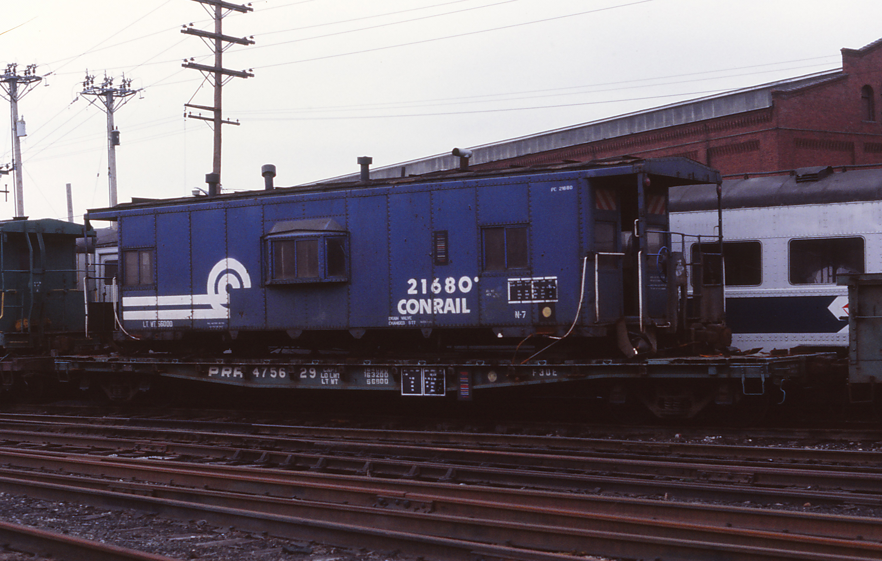 PRR 475629 is seen loaded with wrecked CR 21680 at Reading, PA in March of 1979. Note car is painted in PC green but still carries it PRR number.