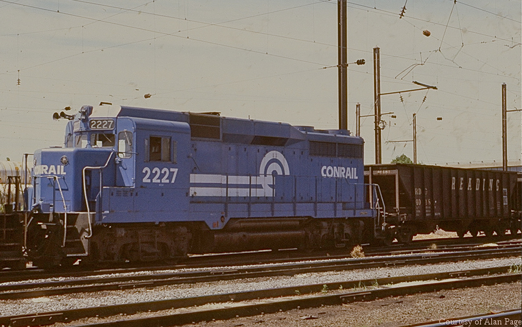 CR GP-30 2227 is last in a duo of GP-30's pulling a line of hoppers, including RDG 3-bay hopper class HR1C 40181, at Morrisville on a bright day in July, 1978.