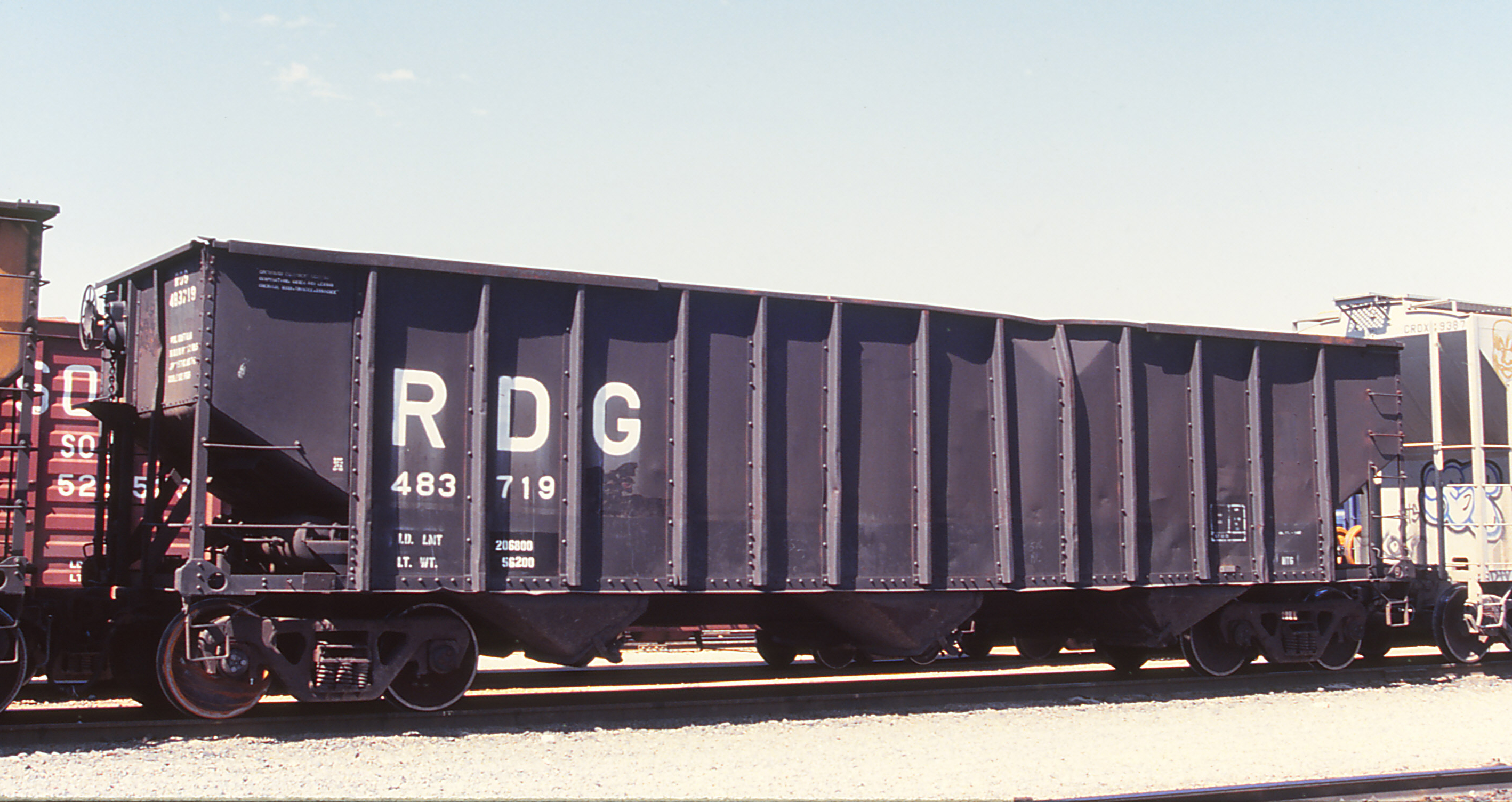 RDG 483719 is seen a long way from home on SP rails at Roseville, CA in Nov of 1994. Car was built 12-75 by Bethlehem Steel. It was deleted 10/1/01 and became RBMN 7258 which was then deleted 3/6/14.