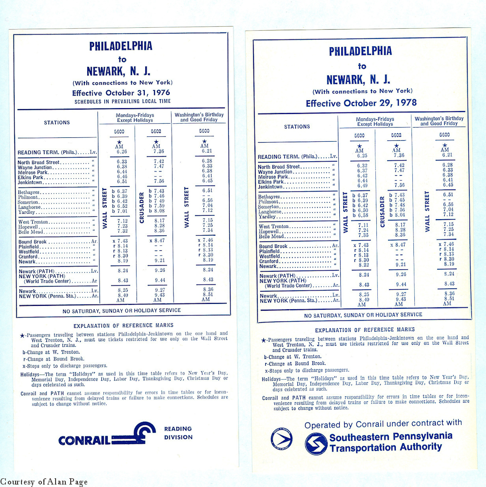Following the joint Reading Railway System/Central RR Co. of NJ's transition to Conrail-contracted operations on their Reading Division/NJ Division commuter lines in April, 1976, the "Newark to Philadelphia" timetable was initially revised May 23, 1976 to show the new "ConRail" logo, with lines above and below.