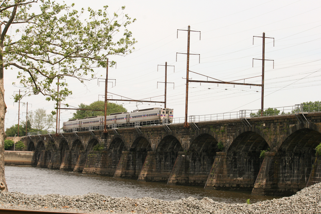 Silverliner IVs 132, 131, 448, and 447 head northbound across the Delaware River bridge at Morrisville, PA on June 1, 2021.