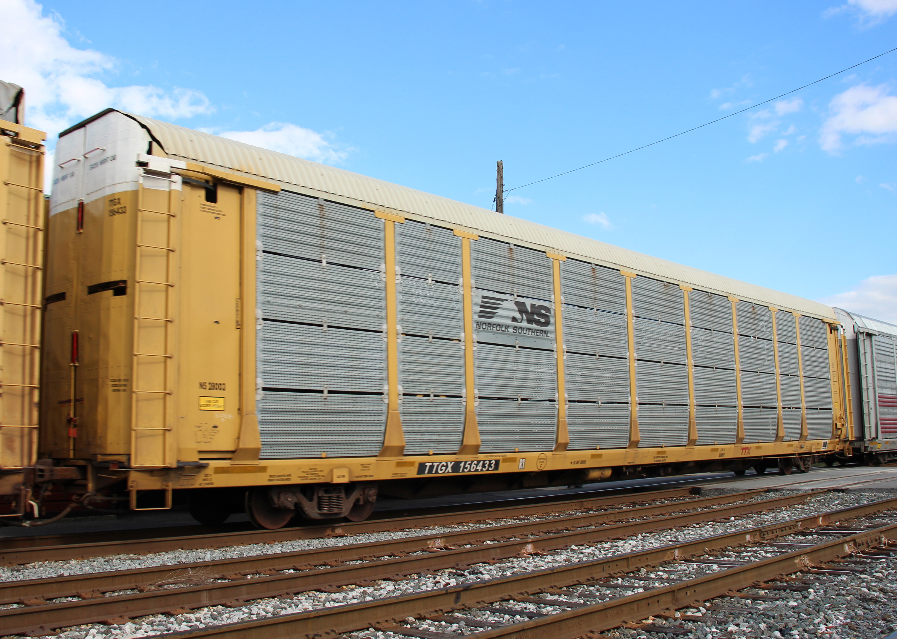 TTGX 156433 is seen in the consist of CSX Q217-20 at Brunswick, MD on 10/20/18. Rack was built as CR 8057, a CR ML2L class rack, in 4-90, then was rebuilt, repainted and renumbered to NS 28003 in 5-14. Rack is now classed FB554 by NS.