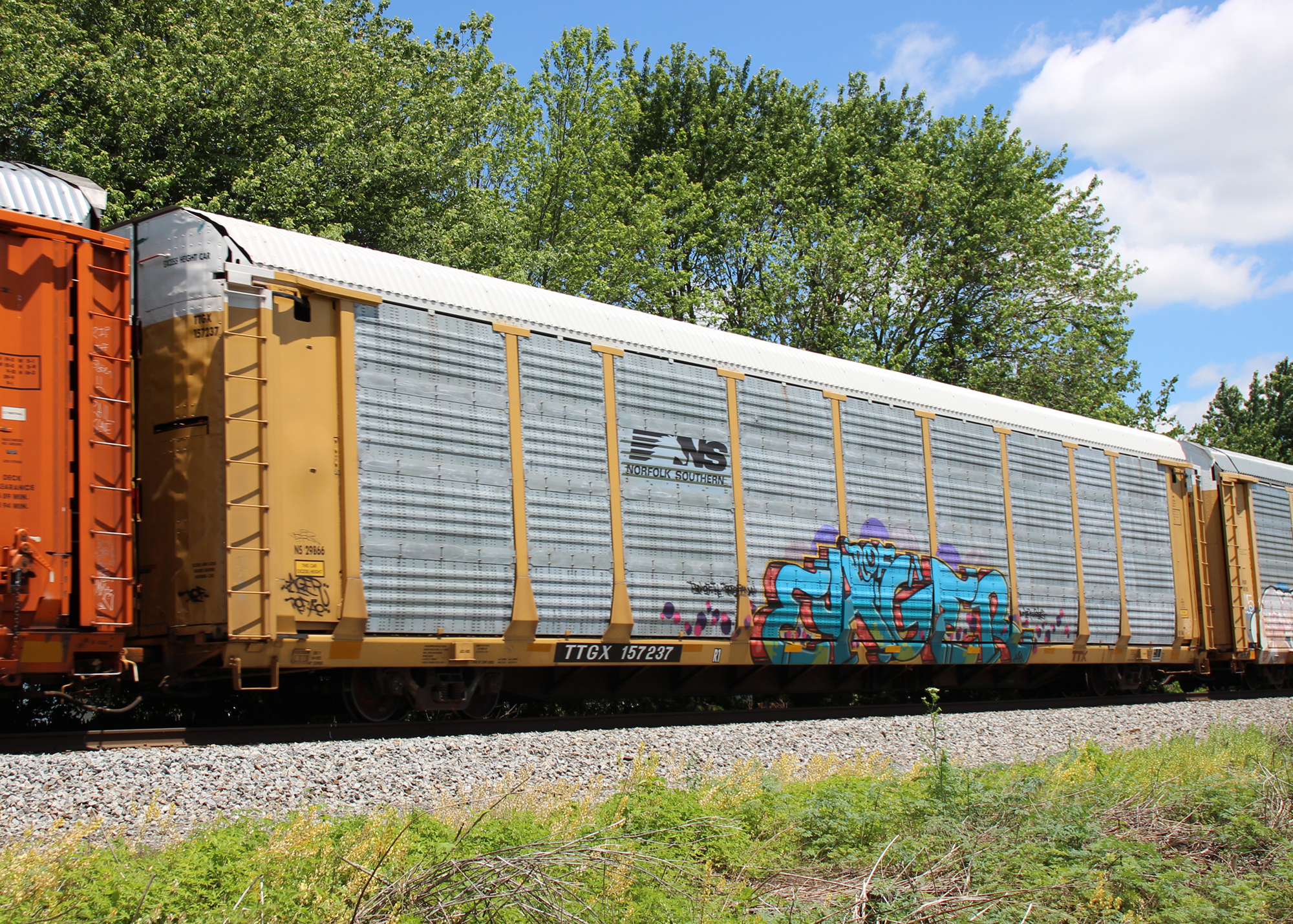 TTGX 157237 is seen in the consist of CSX Q216-28 at Newark, DE on 5/31/21. Rack was built as CR 8411, a CR ML2L class rack, in 6-90. It was then rebuilt, repainted and renumbered to NS 29866 in 9-19. Rack is now classed FB548 by NS.
