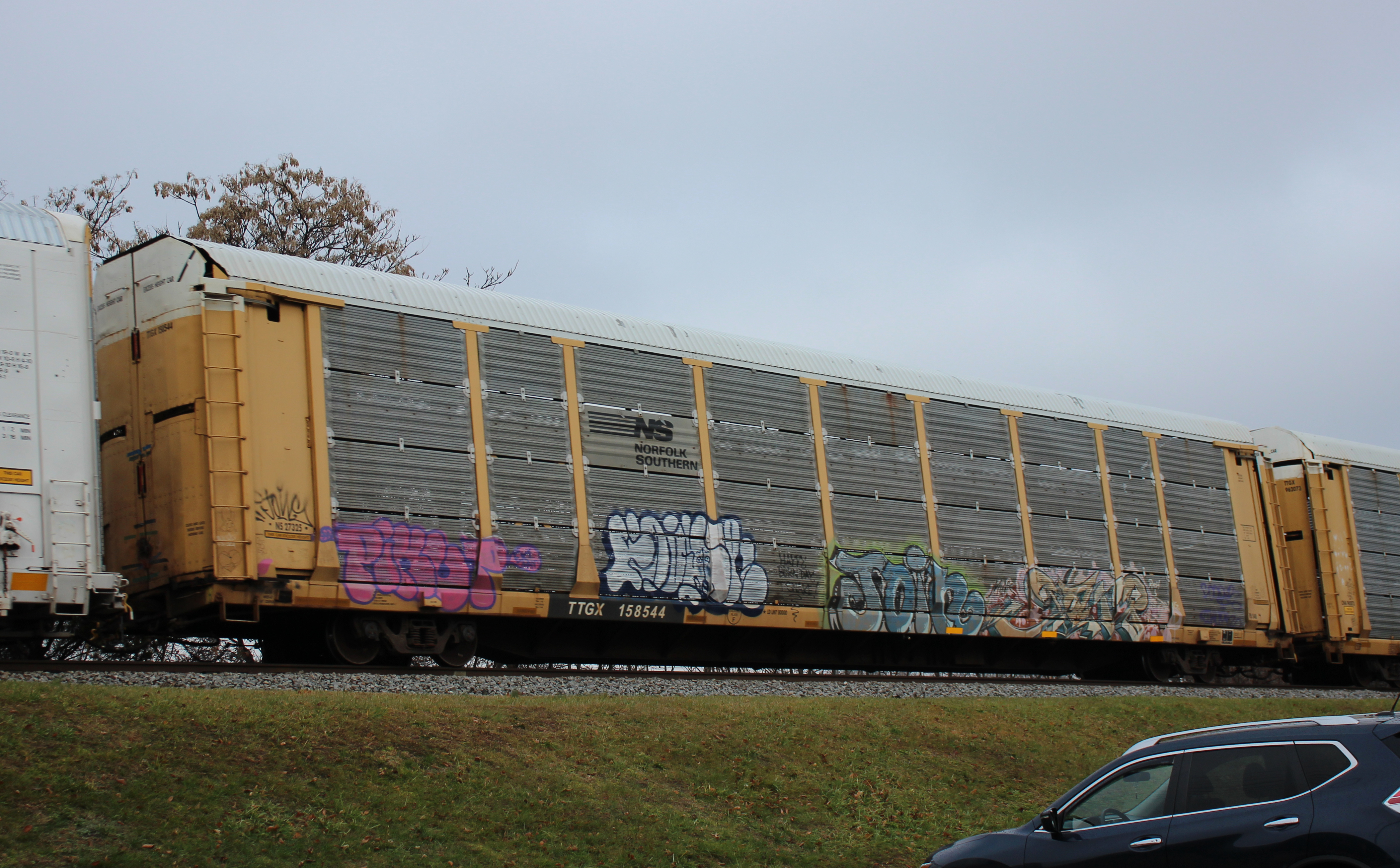 TTGX 158544 is seen in the consist of CSX Q217-30 at Newark, DE on 12/30/21. Rack was built as CR 8158, a CR ML2L class rack, in 4-90. It was then rebuilt, repainted and renumbered to NS 27325 in 2-06. Rack is now classed FB548 by NS.