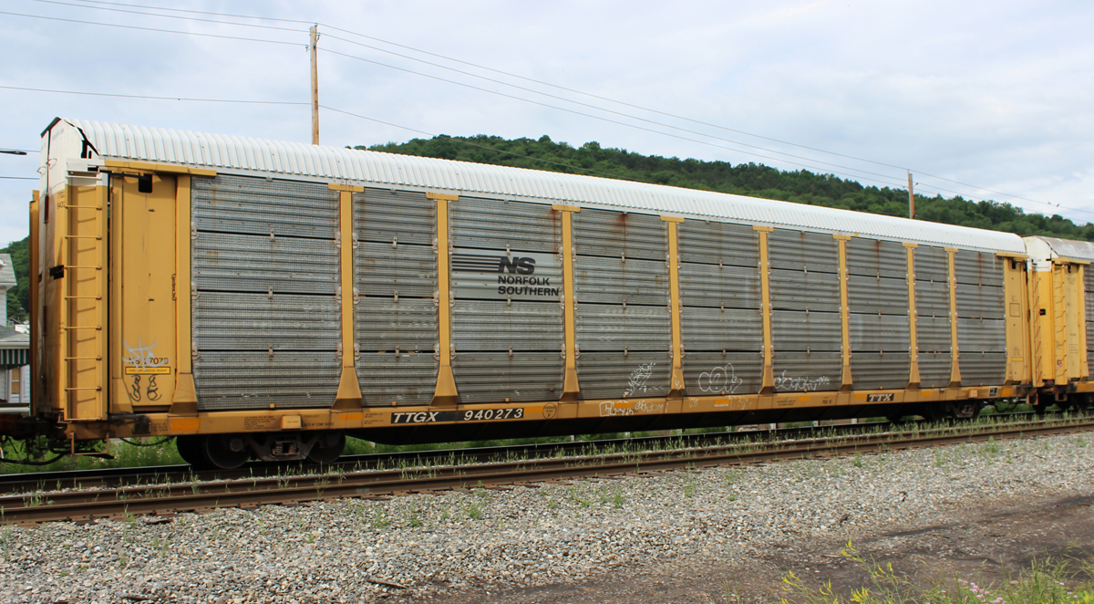 TTGX 940273 is seen in the consist of CSX Q278-10 at Cumberland, MD on 6/12/14. Rack was built as a unknown CR ML2M class rack in 4-91 and rebuilt, repainted, and renumbered to NS 27079 in 4-05. Rack is now classed FB549 by NS.