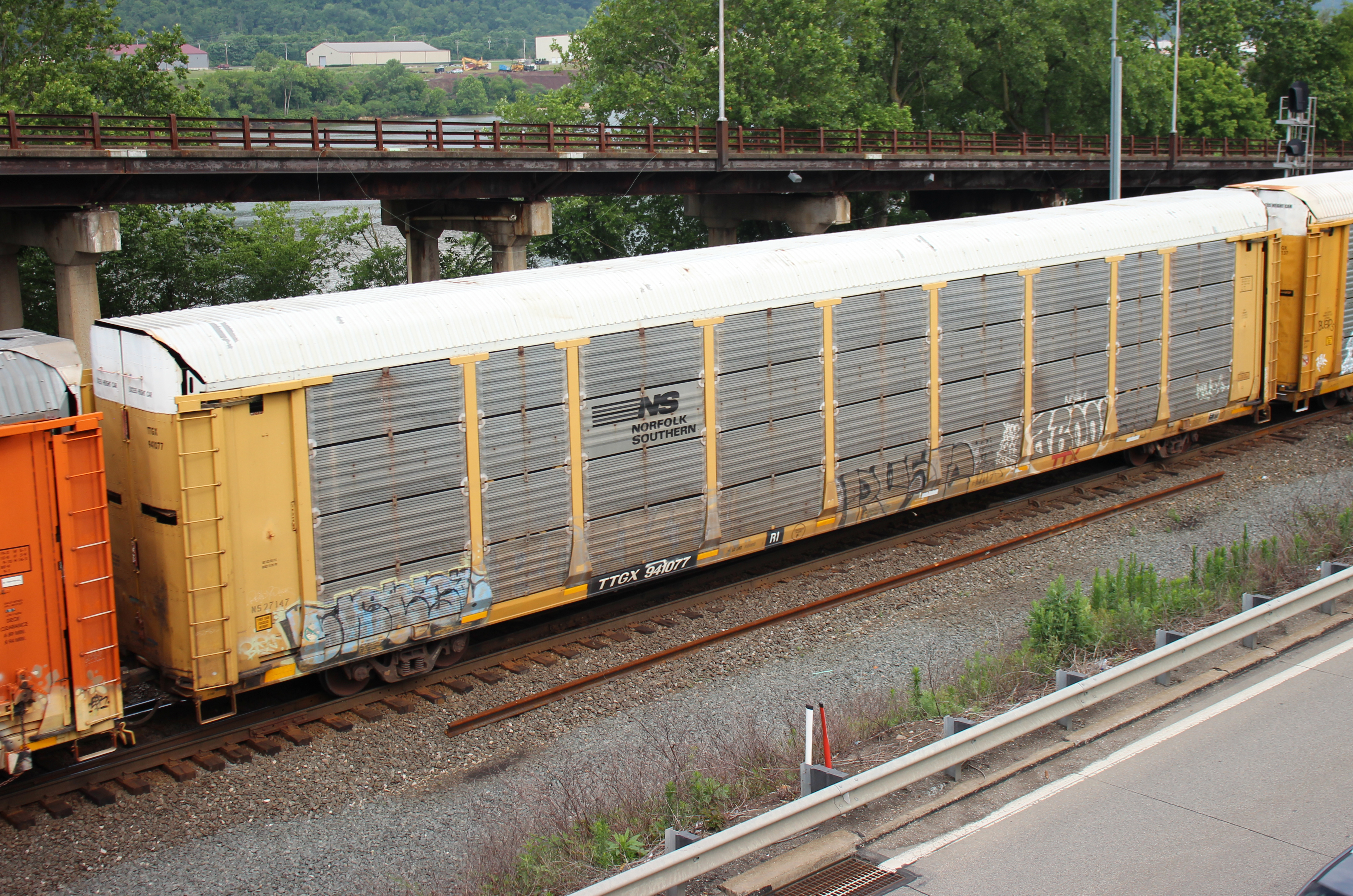 TTGX 941077 is seen in the consist of NS 11N at Baden (East Conway), PA on 6/28/25. Rack was built as an unknown CR ML2L class rack in 1-92. It was then rebuilt, repainted, and renumbered to NS 27147 in 6-05 by PRDK. Rack is now classed FB550 by NS.
