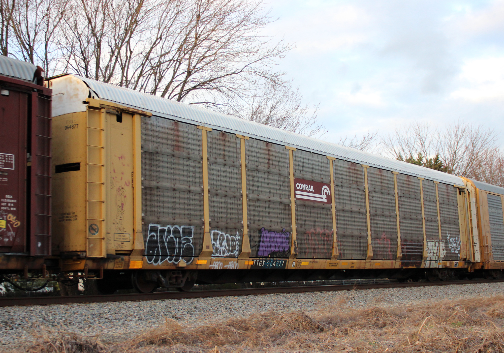 TTGX 964877 is seen in the consist of CSX Q216-17 at Newark, DE on 3/20/22. Rack number is CR 8143, built 1-90, rebuilt 5-98 and is now owned by NS.