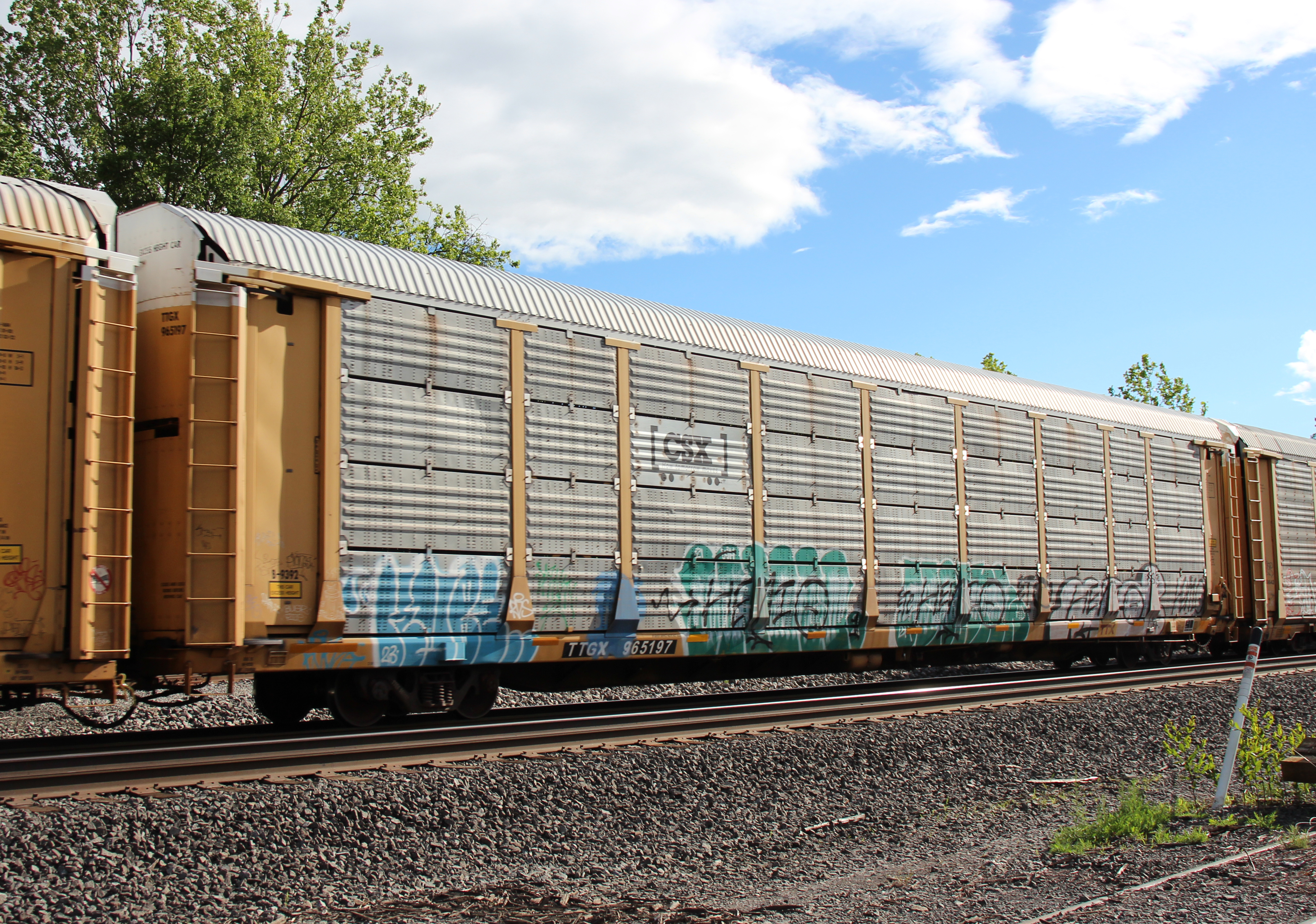 TTGX 965197 is seen in the consist of NS 11N at Sinking Spring, PA on 5/24/25. Rack was built as CR 9392, a CR ML2L class rack, in 2-93. It was then rebuilt, repainted, and renumbered to CSX B-9392 in 8-18 by MEI.