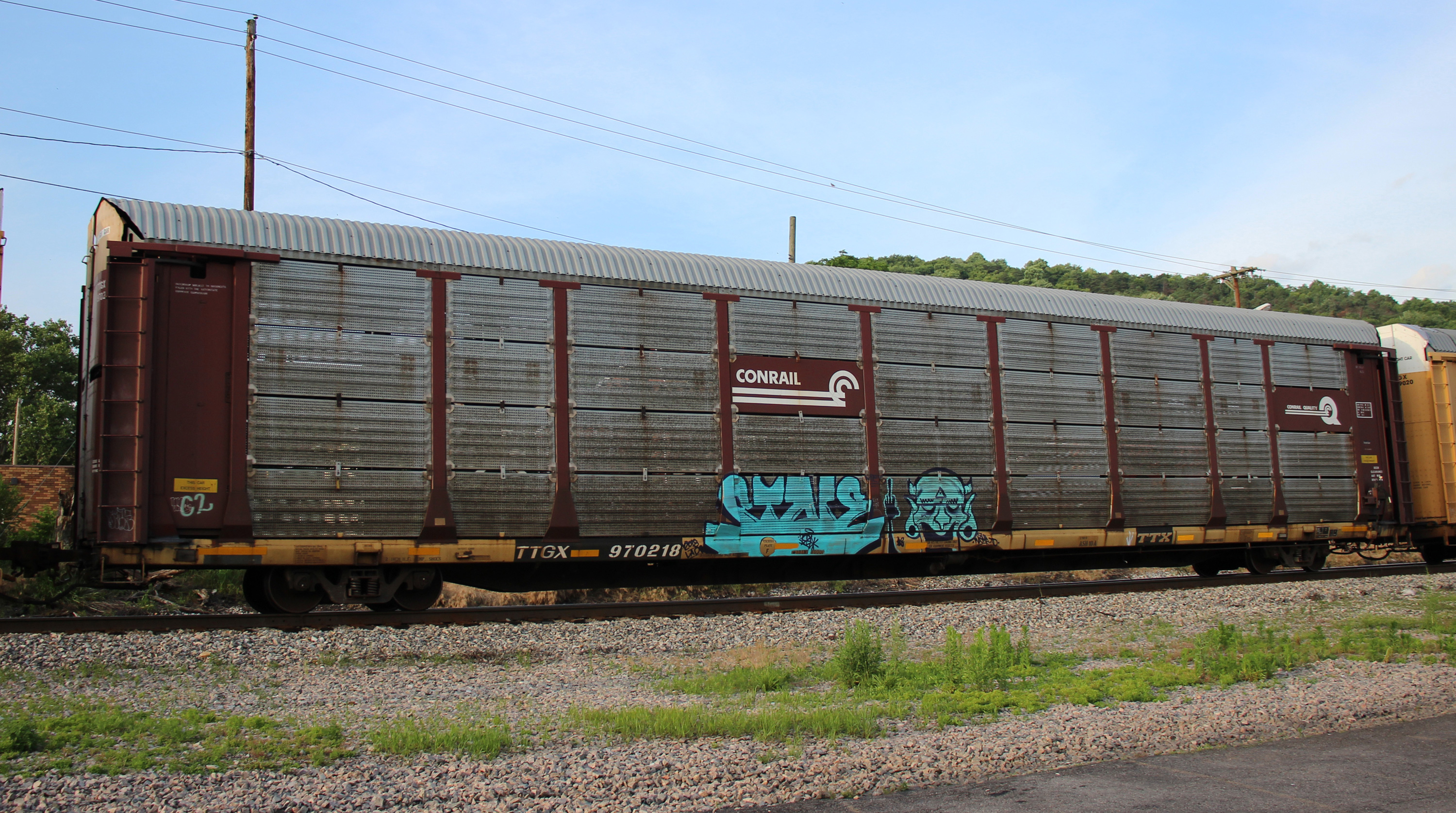 TTGX 970218 is seen in the consist of CSX Q217-13 at Cumberland, MD on 6/13/18. Rack number is CR 10227, built 9-94, and is now owned by CSX.