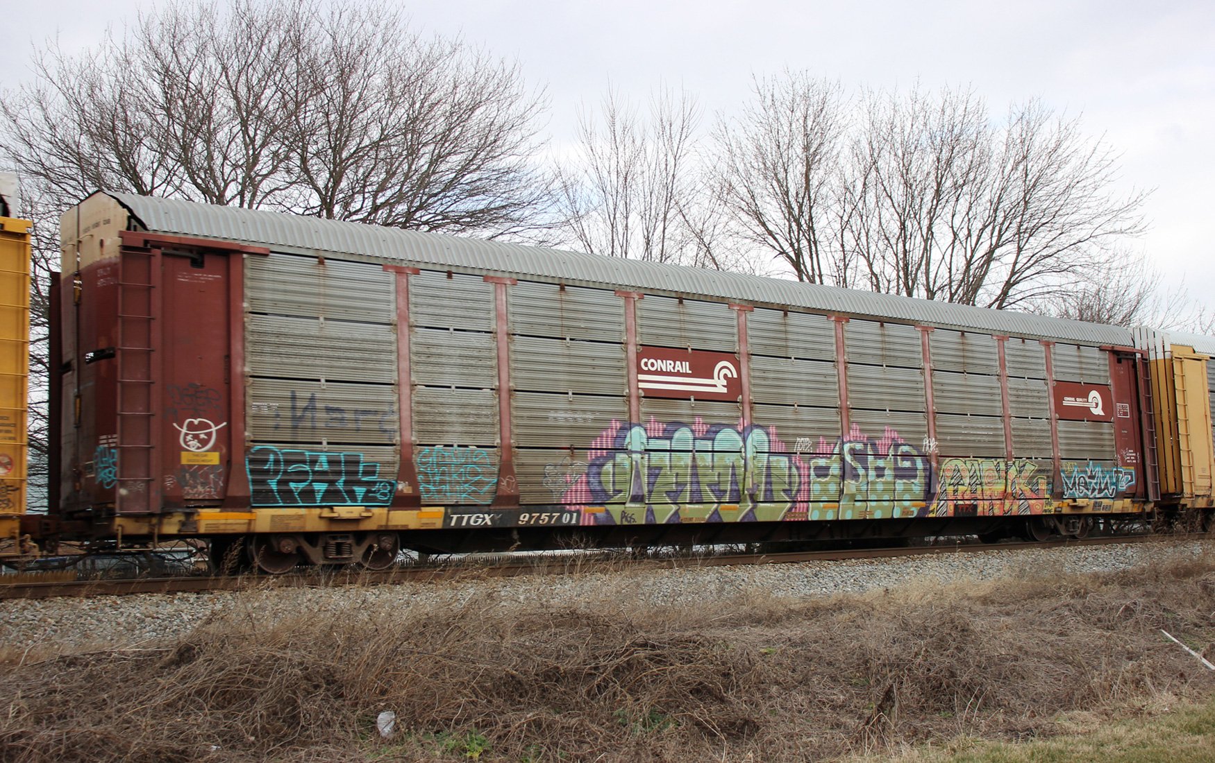 TTGX 975701 is seen in the consist of CSX Q216-27 at Newark, DE on 2/29/20. Rack number is CR 10166, built 9-94 and is now owned by CSX.