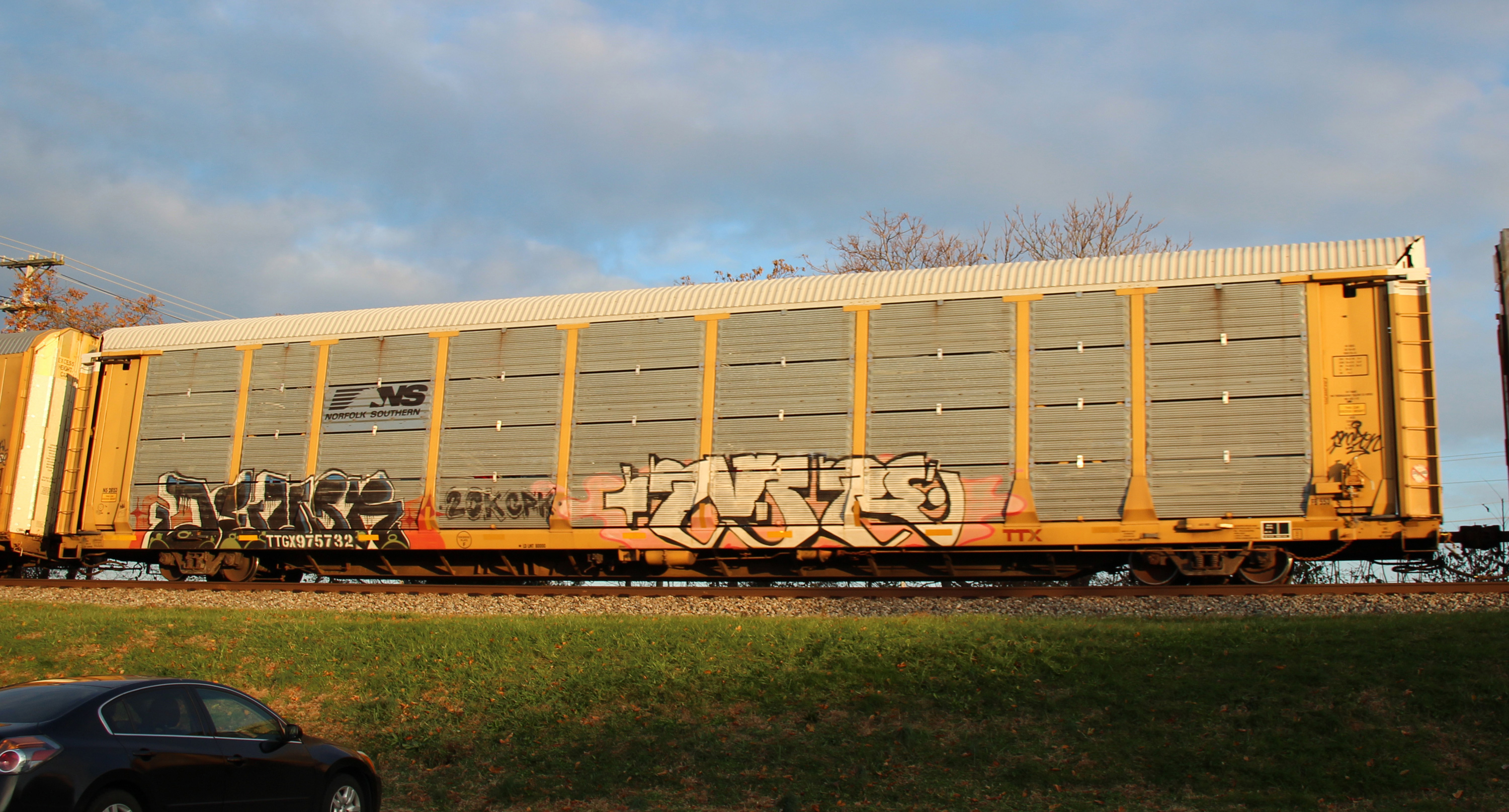 TTGX 975732 is seen in the consist of CSX L276-14 at Newark, DE on 11/17/18. Rack was built as CR 9785, a CR ML2L class rack, in 10-93, then was rebuilt, repainted, and renumbered to NS 28153 in 1-15. Rack is now classed FB553 by NS.