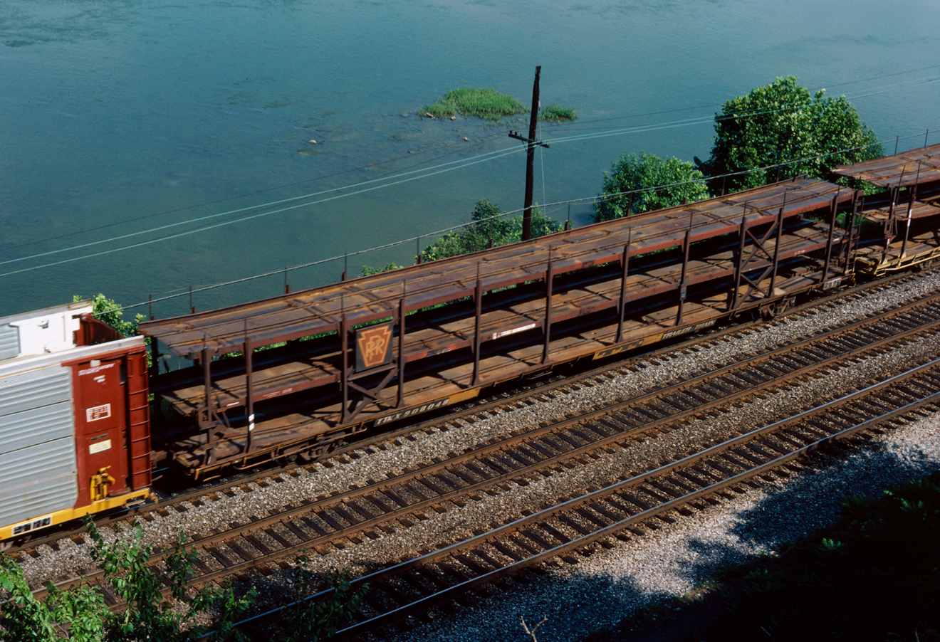 TTKX 908048 with a PRR tri-level rack was photographed on westbound LMPI-4 at Amity Hall, PA on 8/5/81. Flat was built 12-67, and later became ETTX 908048.