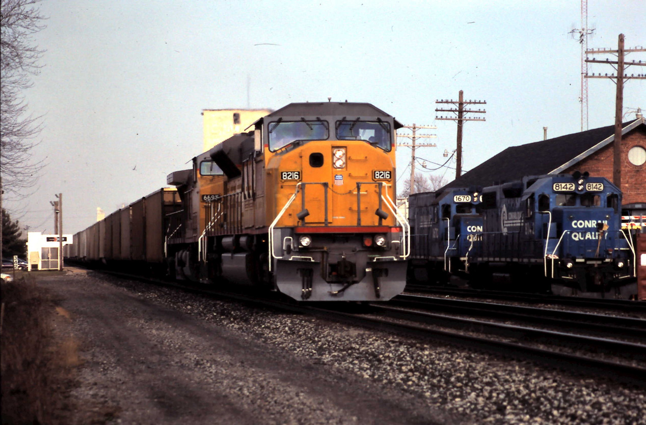UP 8216 and 6695 leads empty coal train UDM-8WH at Bryan, OH on April 2, 1999. This is one is coming back from Detroit Edison's Monroe, MI power plant. Chris Howe photo